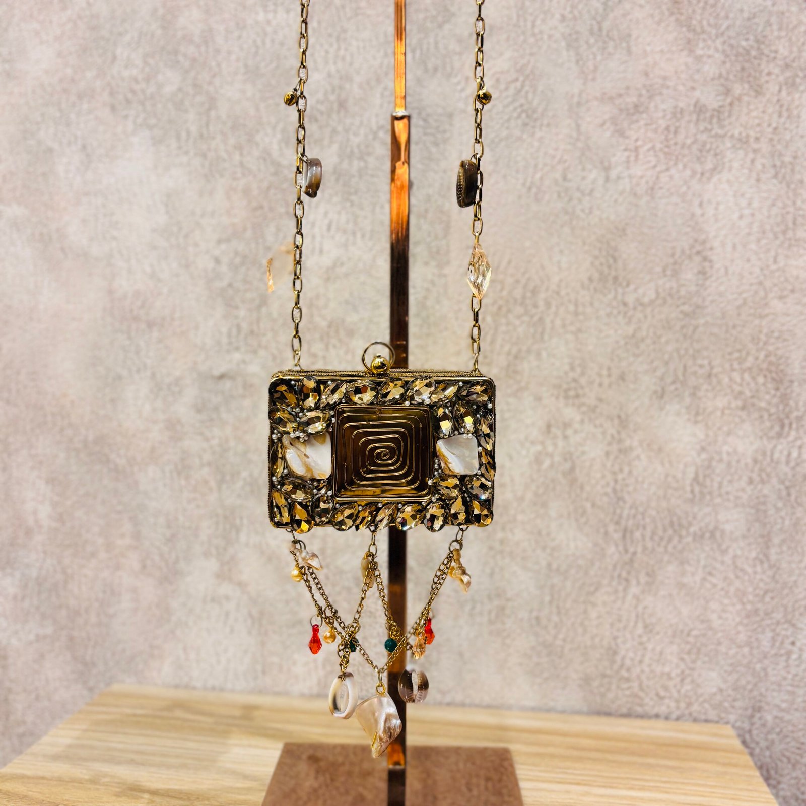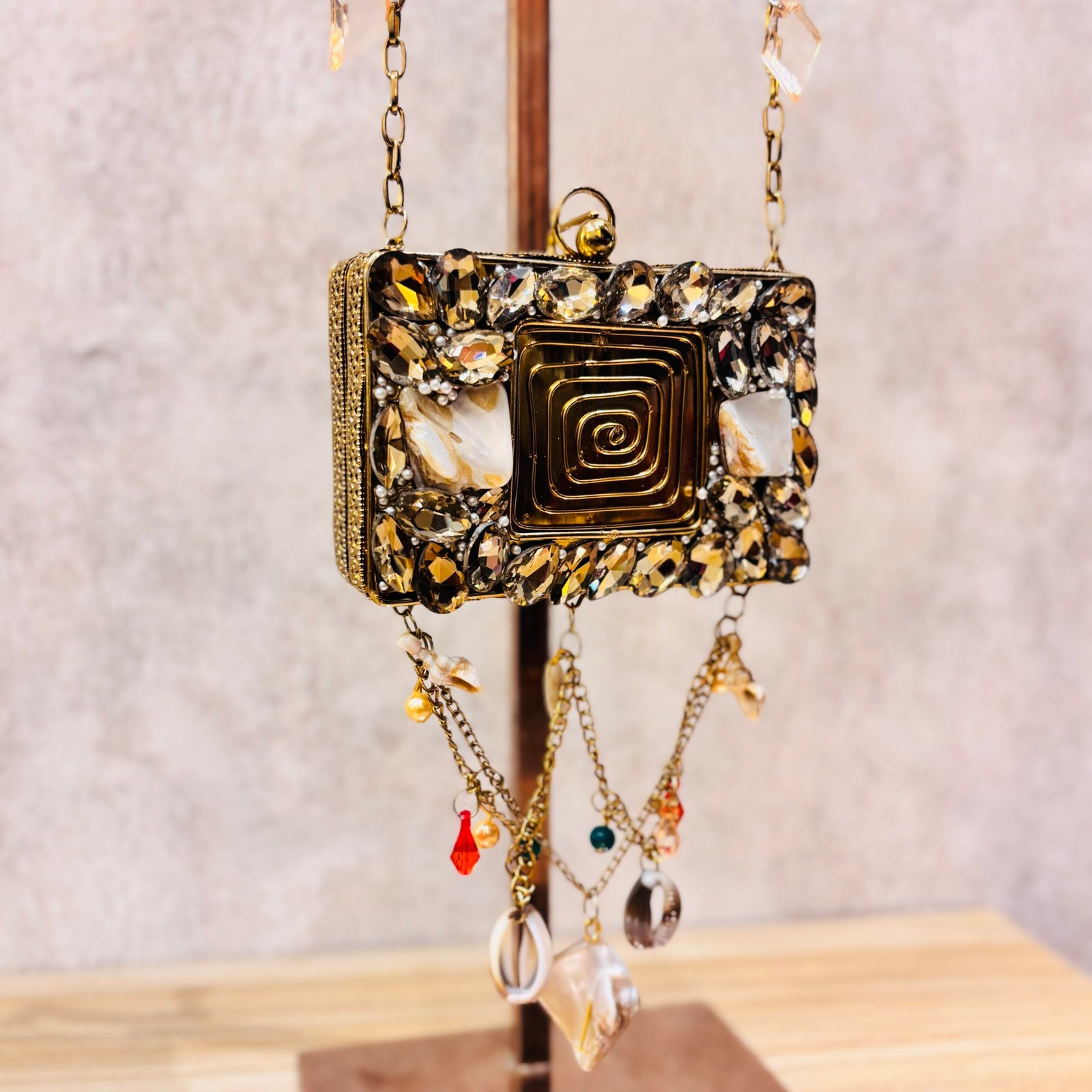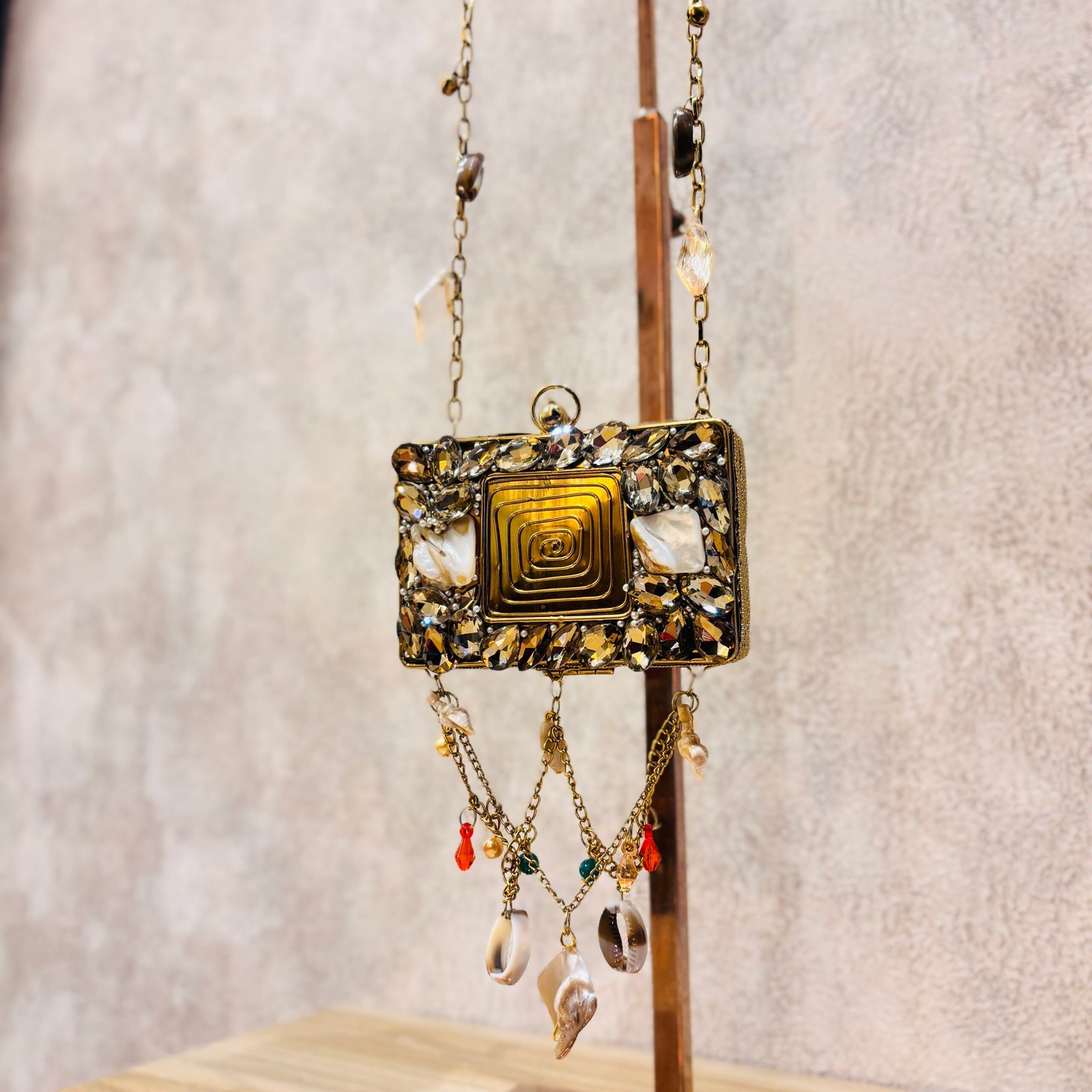 Elegant round crystal-embellished sling bag with pearl accents and cascading charms—perfect for evening events, weddings, and special occasions.